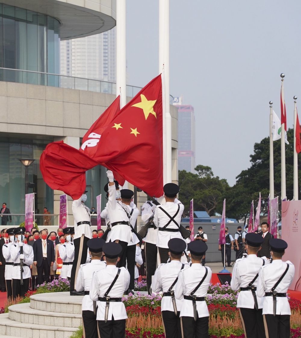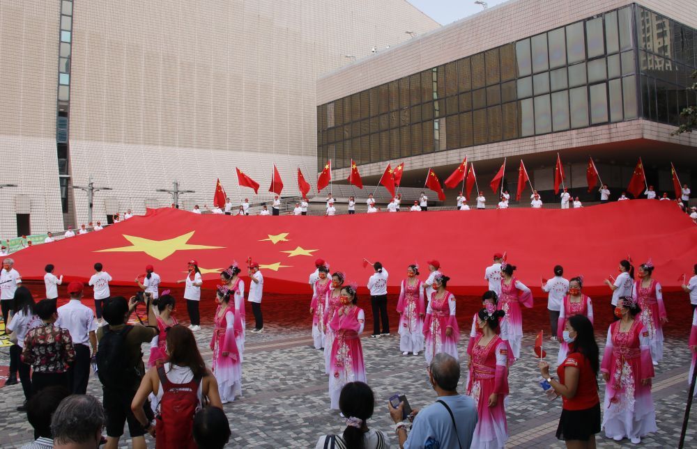 10月1日上午8點,金紫荊廣場。「起來!不願做奴隸的人們!把我們的血肉,築成我們新的長城……」伴隨着莊嚴的國歌聲,鮮艷的五星紅旗和紫荊花區旗冉冉升起。香港特區政府舉辦的國慶升旗儀式在此舉行,數百名嘉賓在廣場上肅立,對國旗行注目禮。