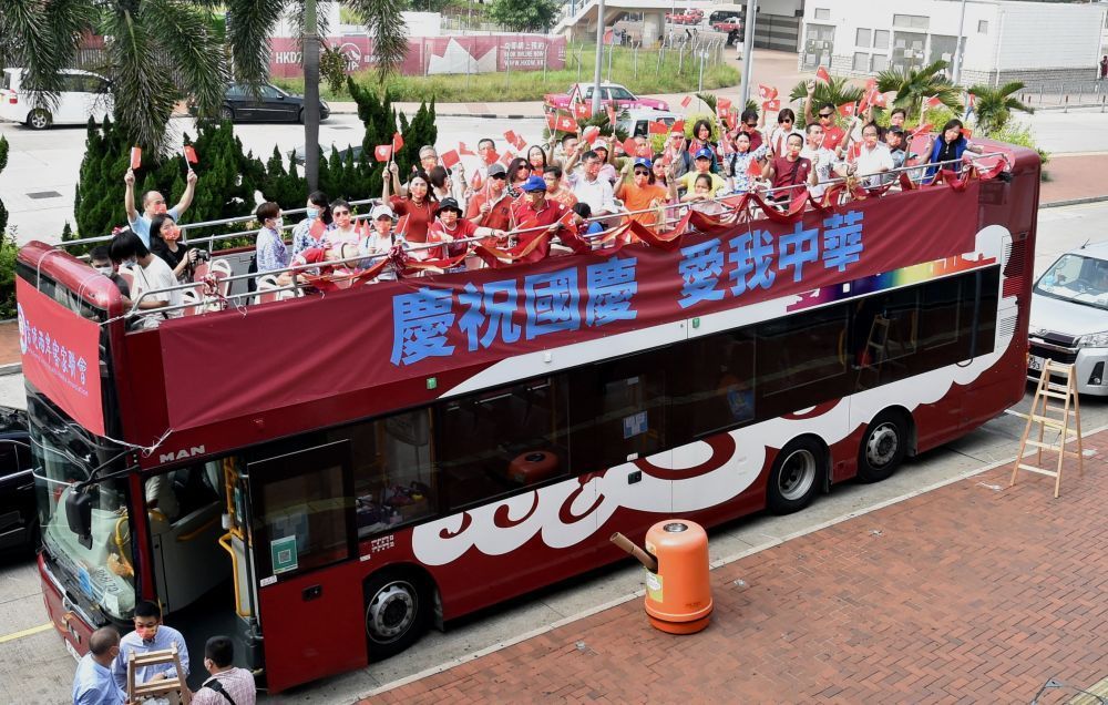 10月1日,香港市民參加慶祝國慶巴士巡遊活動。新華社記者 盧炳輝 攝