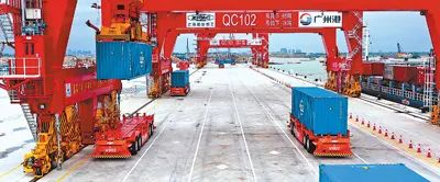 在广州港南沙四期工程实船联合调试现场,无人驾驶智能导引车在运输集装箱。这套自动化操作系统融合了北斗导航、5G通信、人工智能等先进技术,我国拥有完全自主知识产权。