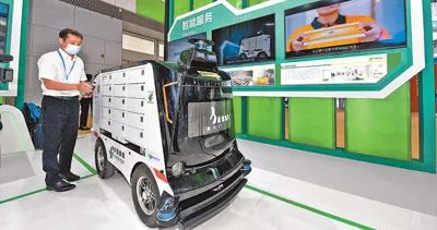 在第五届世界智能大会的科技展上,工作人员通过智能设备控制无人投递车。