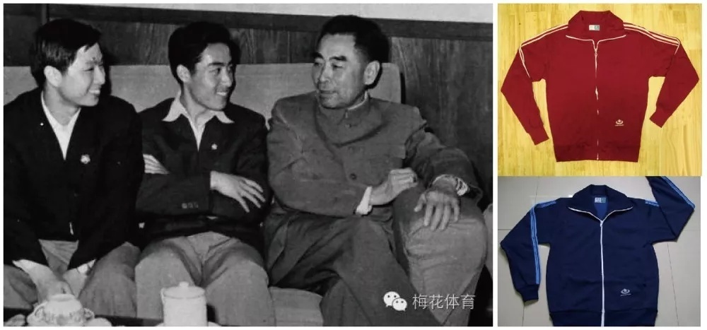 左图:周恩来总理接见庄则栋、徐寅生。右图:梅花“士林蓝”和“国红”运动服剪影
