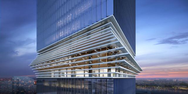 4号楼中部的层高明显高于其他楼层,这一区域为何与众不同?原来,这一部分引入“海市蜃楼”的概念,利用突变层的错落布局、架空空间,建设云端泛会所。未来将设置为“避难层+公共空间”功能区域,为入驻企业提供空中会客厅和多种商务服务场景。结合该功能区域位置,项目通过渐变的水平遮阳构件及内退的玻璃幕墙,在空中营造出极富传统文化特色的阁楼形象,形成渐变云层的视觉效果,为塔楼提供了视野开阔的共享交流平台,提升空间景观价值,同时改变了室内外的互动方式。