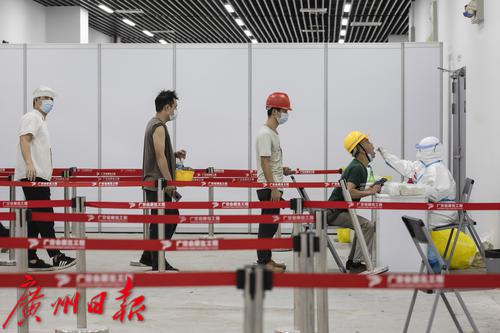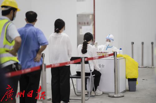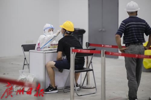 广交会展馆内设置有核酸检测点,参与筹展的工人及工作人员可随时在此进行核酸检测。