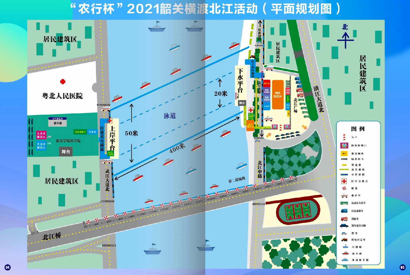 本月10日横渡北江起点为浈江区北江广场亲水平台,终点为韶关学院医学院的北江西岸,全长约400米。活动当日还将进行小黄鸭、皮划艇、水上飞人等水上运动表演及韶关特色采茶戏文艺展演。