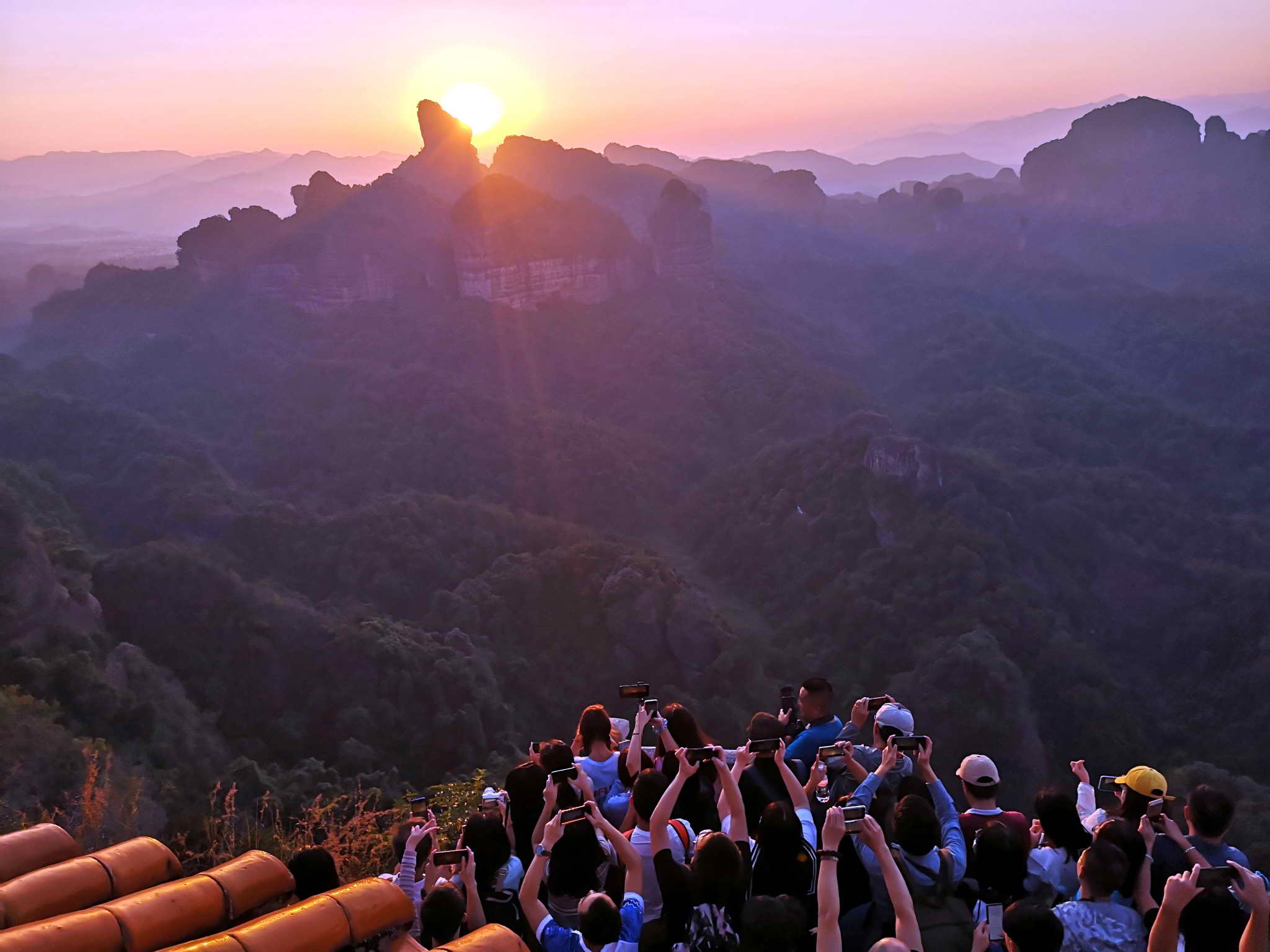 记者了解到,“十一”假期在丹霞山观看日出的游客非常多。每天凌晨4点半起,丹霞山舵石、韶音亭、观日亭等丹霞山主要观看日出的观景台都站满了游客。他们有的全家出动,有的三五好友结伴同行。当旭日发出第一缕曙光,在僧帽峰与云天相交的东方,太阳冉冉升起,金光四射,远处的群峰在薄雾中若隐若现,赤壁丹崖显得金碧辉煌。游客用相机、手机、无人机接连不断地记录下这幅唯美的山水画。