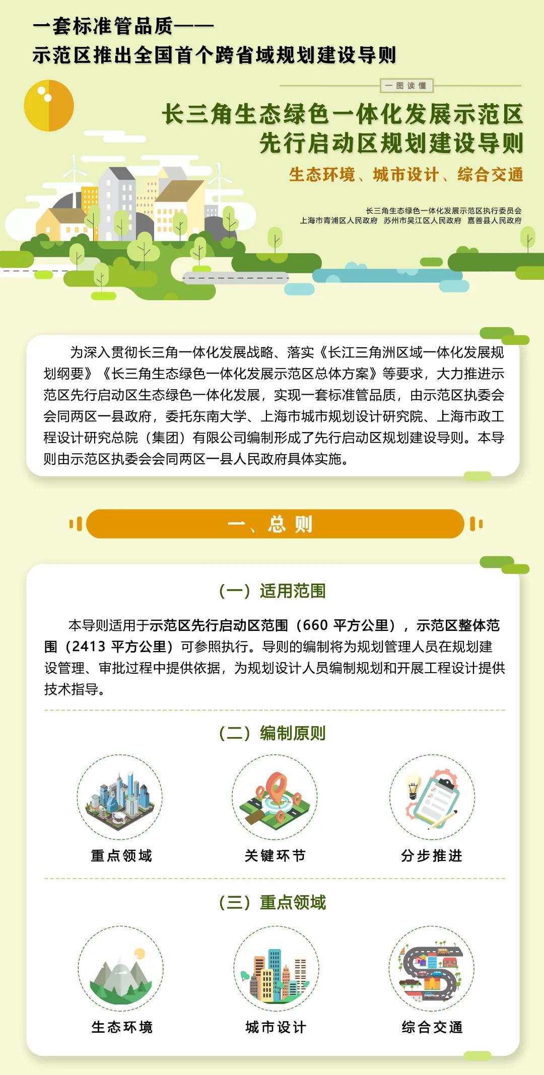 据介绍,长三角一体化示范区包含江苏省苏州市吴江区、上海青浦区、浙江省嘉兴市嘉善县三地。这份导则适用于先行启动区范围(660平方公里),示范区整体范围(2413平方公里)可参照执行。《导则》将为规划管理人员在规划建设、审批过程中提供依据,为规划设计人员编制规划和开展工程设计提供技术指导。