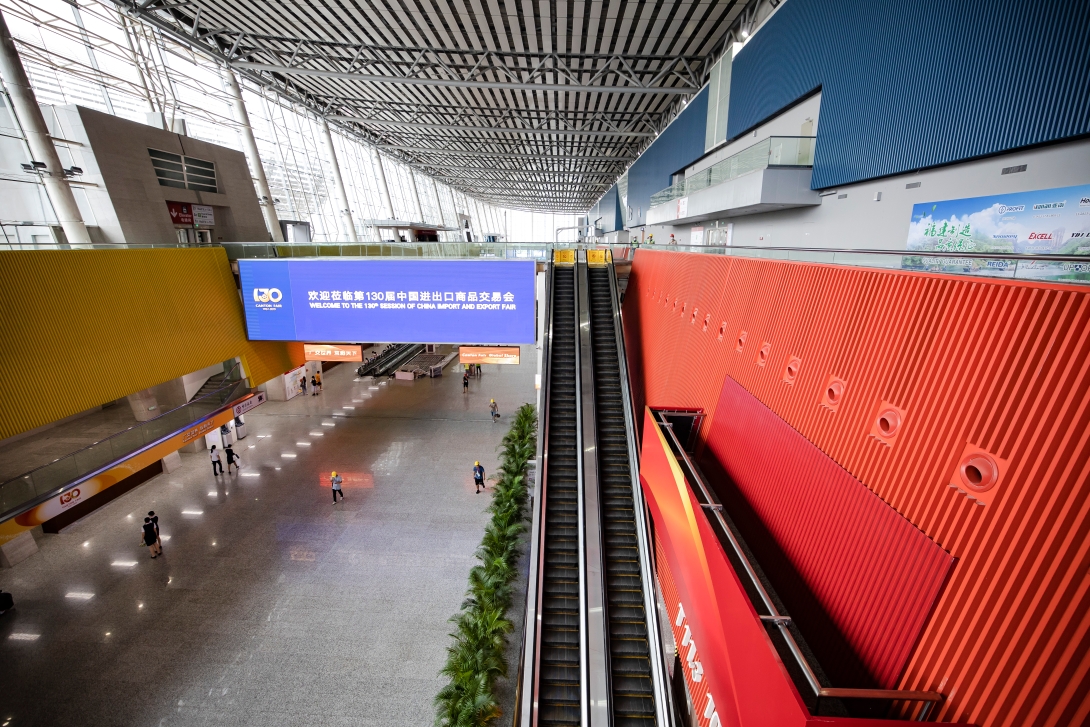走进广交会展馆,就能看到“中国进出口商品交易会”的金字招牌下竖起了一面绿墙,墙上“广交世界,互利天下”的标语引人关注。绿墙之下,则是一片红色花海,由数字“130”、英文简称(CANTON FAIR)、标识“宝相花”和展会历程(1957—2021)共同组成的金灿灿的标识置于其中,分外醒目。