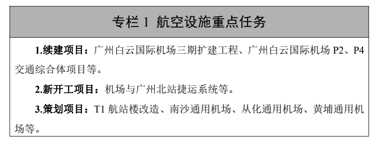 在航空枢纽基础设施布局建设方面,加快推进广州白云国际机场三期扩建工程,完成白云国际机场第二航站楼东四、西四指廊,第四、第五跑道,第三航站楼及综合交通中心建设。至2025年建成具备5条跑道、3个航站楼一流门户枢纽机场,实现白云国际机场旅客吞能力突破1亿人次。