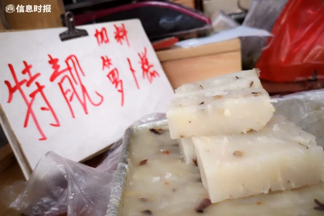 采访当天,最先售罄的是芋头糕。比起茶楼里粉多芋头少的芋头糕,连姐制作的芋头糕里,大块的芋头颗颗分明,口感扎实绵密。前来购买的街坊,大多都是论斤买。“我们除了自己买回家吃,还会帮亲戚朋友代购。这里的芋头糕分量很实在,吃一块就有饱腹感。”