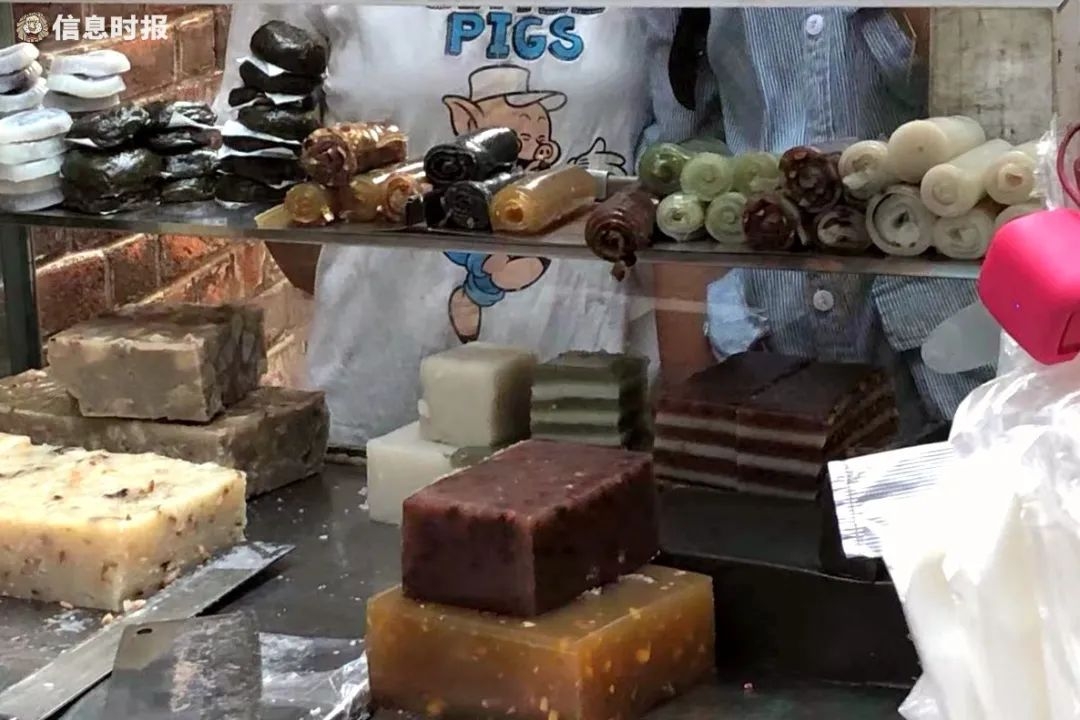 世居泮塘的黄永锐是信栈老铺的第三代传人,“我家从阿爷那代就开始磨马蹄粉啦,小时候,我们家老店就开在荔枝湾涌旁,与文塔隔着河涌对望。旧屋有3层高,首层卖马蹄粉,工人们在屋前的空地磨马蹄粉,每年春节前是生意最忙的时候。20世纪60年代旧屋拆迁,信栈才搬到了如今的龙津西路。”