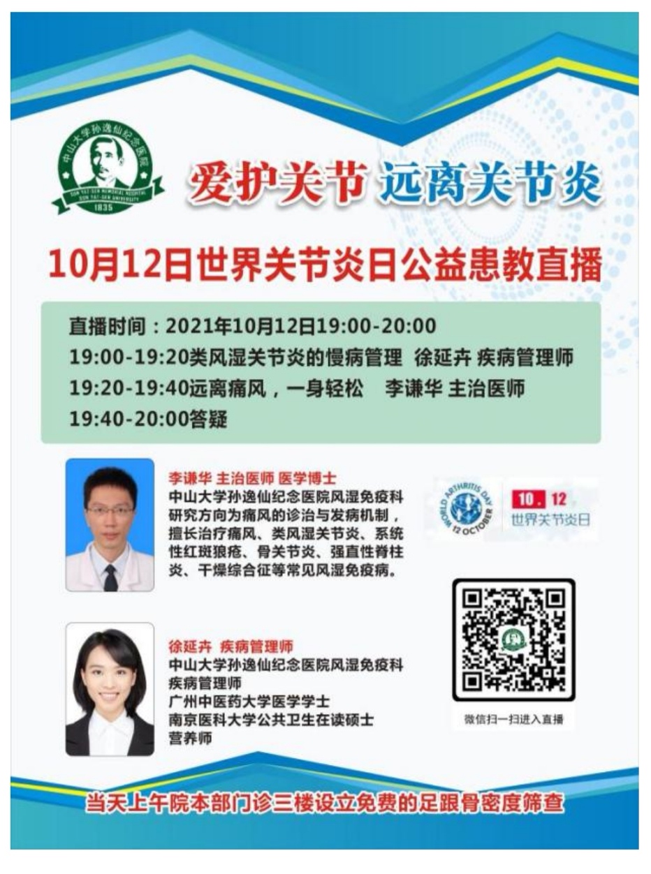 针对关节炎,我们需要早预防、早诊断、早治疗,通过改善生活方式和规范的药物治疗应对疾病,防止致残。为了提高全社会对世界关节炎的充分认识、最大程度减少不可逆转的关节损伤,中山大学孙逸仙纪念医院风湿免疫科专家团队将于2021年10月12日举办“世界关节炎日”线上患教直播活动,届时将免费为大家详细讲解类风湿关节炎、痛风等常见关节炎相关问题。 当天上午在该院北院区门诊3楼还会提供免费的足跟骨密度筛查,并有科普书籍限量赠送,欢迎广大市民朋友参加。
