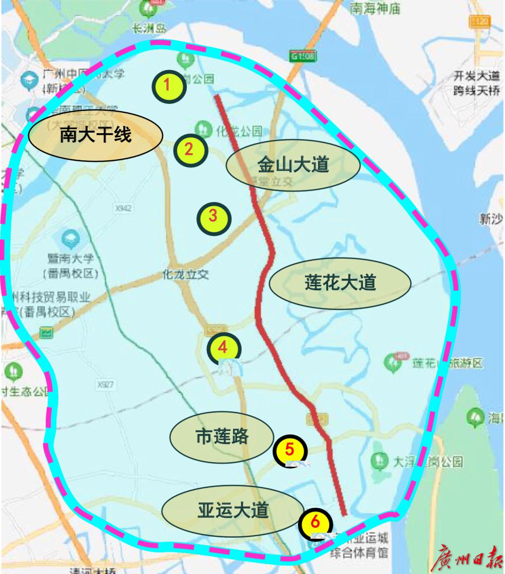 据记者了解,通过对项目影响区域内交通现状、沿线镇街用地及征拆情况进行摸查,并结合最新规划研究项目线位走向及实施可能性,提出一条近期可实施的沙鱼洲隧道南延线方案,线路全长11.9千米,规划红线宽60米。以沙鱼洲隧道至亚运大道之间的路网为基础,研究从石化大道与南大干线交叉口向南打通莲花大道、亚运大道,连接番禺区亚运城。