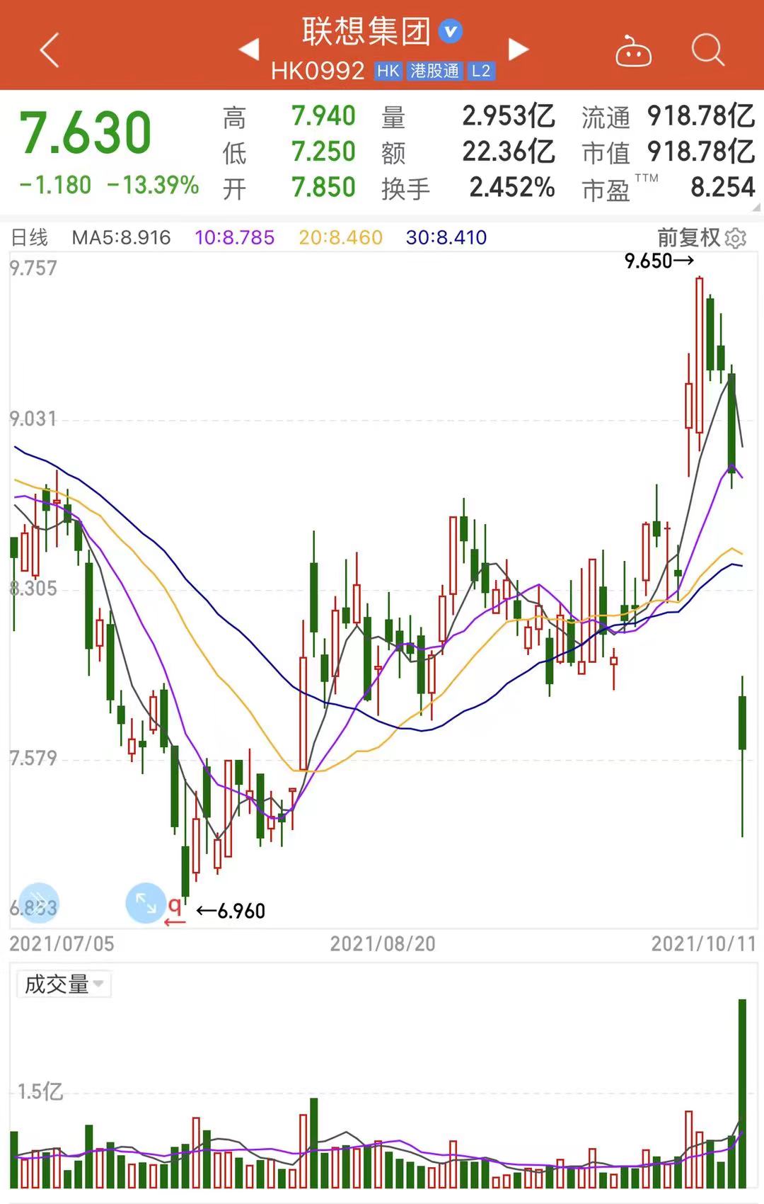 10月11日港股开盘,联想股价出现大幅震荡。截至11日收盘,联想集团股价下跌13.39%,报7.630港元/股,总市值是918.78亿港元。联想控股同样收跌,跌12.52%,报13.840港元。