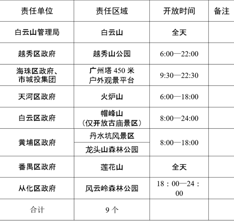 开放登高点包括白云山、越秀山、广州塔、火炉山、帽峰山(仅开放古庙景区)、丹水坑风景区、龙头山森林公园、莲花山、风云岭森林公园,具体开放时间见附表。