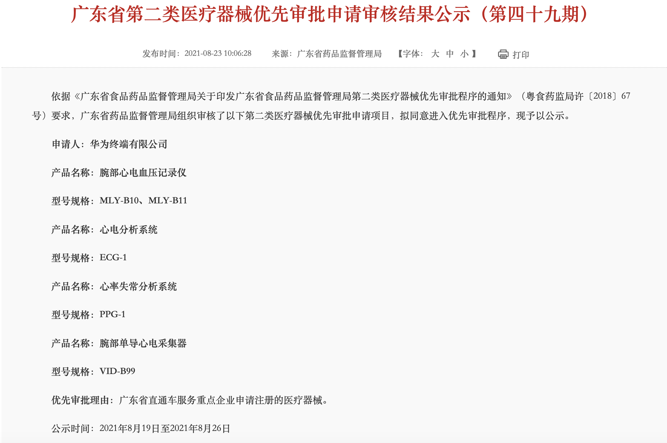 另外,据广东省药品监督管理局网站8月23日消息,除腕部单导心电采集器外,华为还有三款医疗器械进入优先审批程序。分别是腕部心电血压记录仪(MLY-B10、MLY-B11)、心电分析系统(ECG-1)、心率失常分析系统(PPG-1)。
