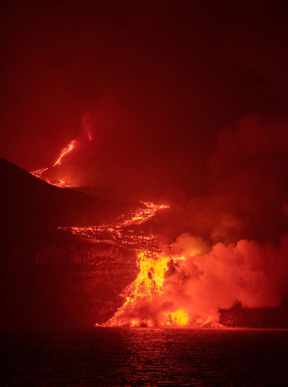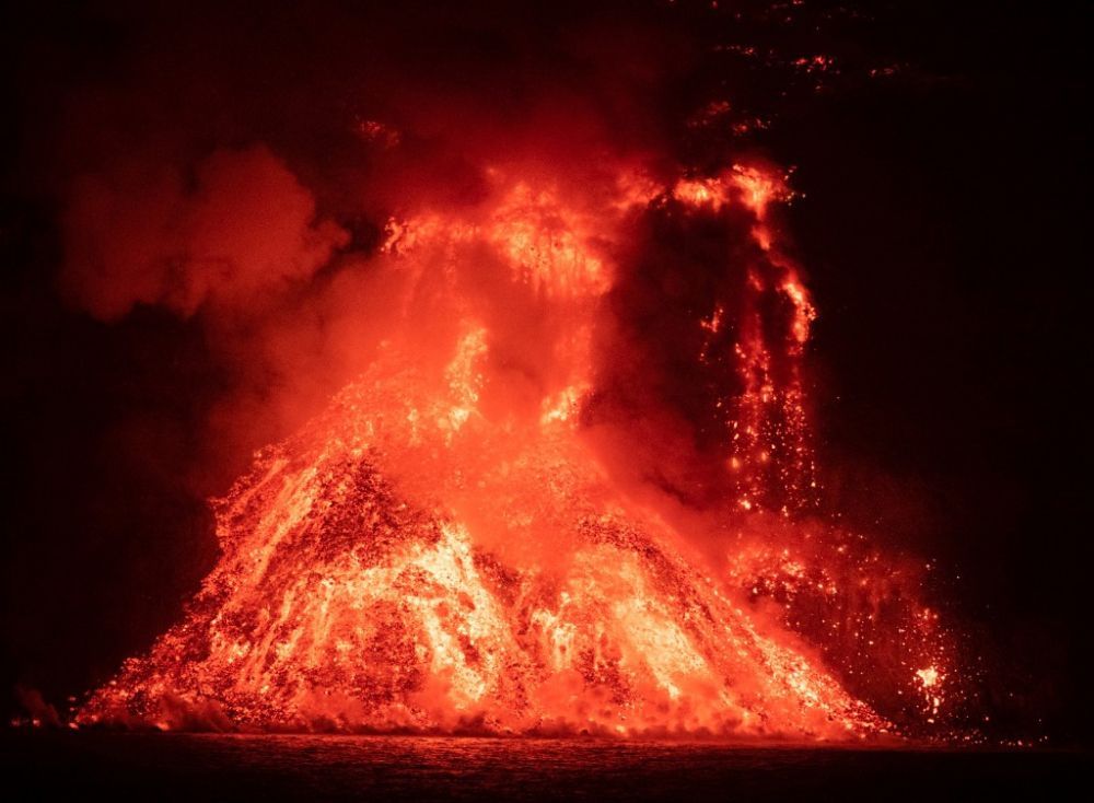 这张9月29日发布的照片显示,西班牙拉帕尔马岛的老昆布雷火山喷发的岩浆流入大海。(新华社发,西班牙海洋研究所供图)
