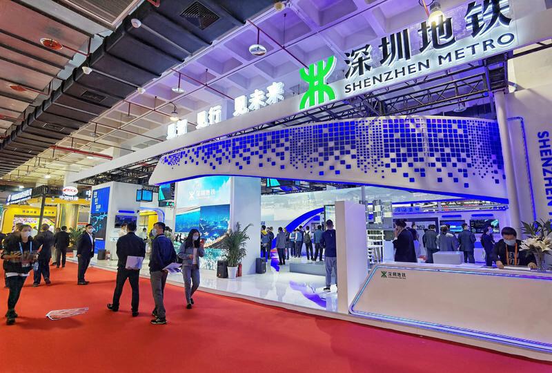 展会上,深圳地铁展区采用300°动态投影设计,整体造型设计犹如向前飞驰的地铁列车。同时,围绕“湾区一张网”“数字化转型”“站城一体化”“精益建设”“卓越运营”五个板块,全方位展现了深圳地铁在智慧赋能城轨交通高质量发展的应用成果,展示了云计算、大数据、绿色能源等技术在轨道交通建设、运营等细分领域的创新应用。
