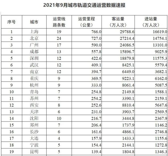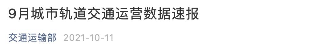 近日,交通运输部发布了各大城市2021年9月份的轨道交通运营数据,并且每个月都会公布一次。