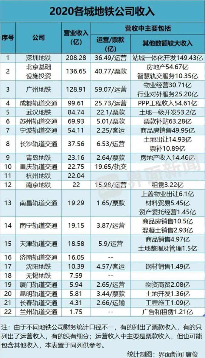 下面是界面新闻统计的各城市2020年地铁营业收入构成: