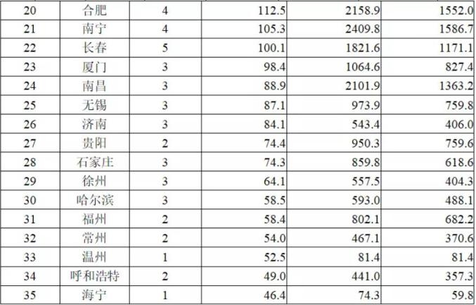 地铁里程(含有轨电车)超200公里的城市只有15个,超300公里只有9个,超500公里的只有上海、北京、广州、成都这4个城市。