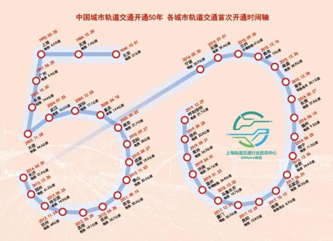 下面这张表展示了各城市首次开通地铁(含轻轨、快轨、单轨)的年份: