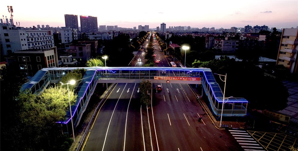 据了解,蚬涌村人行天桥主桥为钢箱梁结构,全长49.2米,桥面宽3.72米,共设置6个上下梯,主要功能为行人及自行车通行。施工单位对人行天桥增设钢结构雨棚、整体美化翻新、彩绘、景观亮化等。