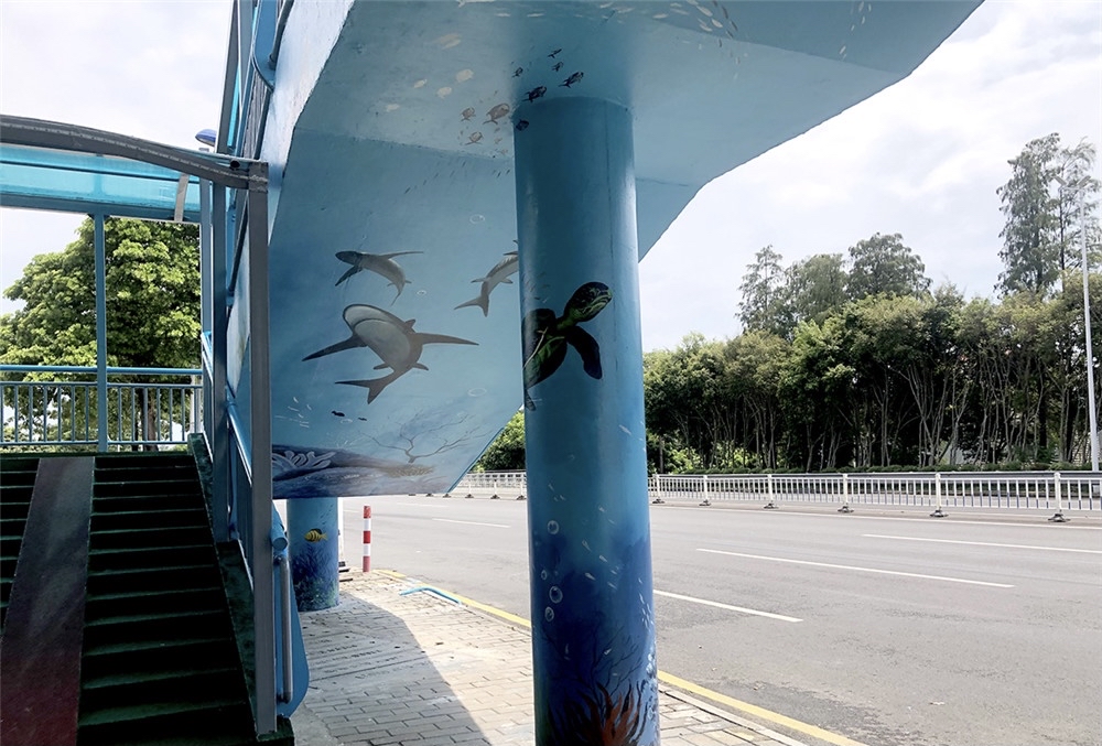 施工方为了让蚬涌村人行天桥更富有特色,专门请绘墙师手绘了以蓝色海洋为主题的彩绘并加盖蓝色的雨棚,使得整个桥以海洋为主题,远远看上去人行天桥变成了蓝色。桥底三五条蓝色的鲸鱼追逐打闹,一只粉红色的大水母正在桥柱上游。这些活灵活现的彩绘吸引了众多学生和家长拍照、观看。夜幕降临,桥身的射灯开启,射灯采用LED灯珠,颜色由红色、蓝色、绿色、白色组成,射灯不停的变化着,装扮着人行天桥。全新的蚬涌村人行天桥为市民群众提供了舒适和安全的通行环境,成为了一道靓丽的风景线。