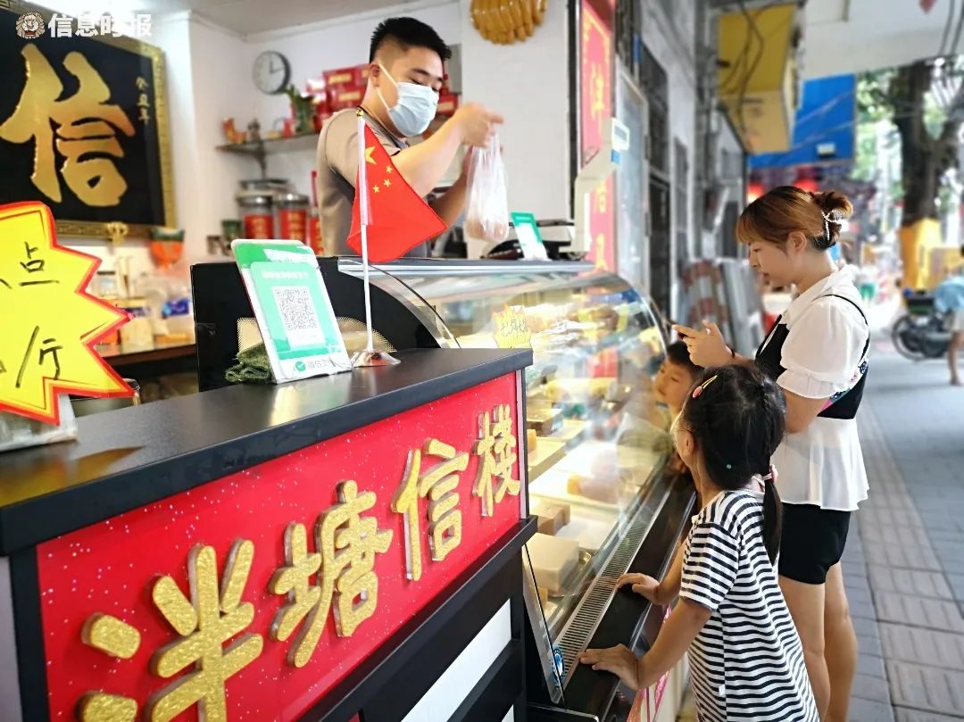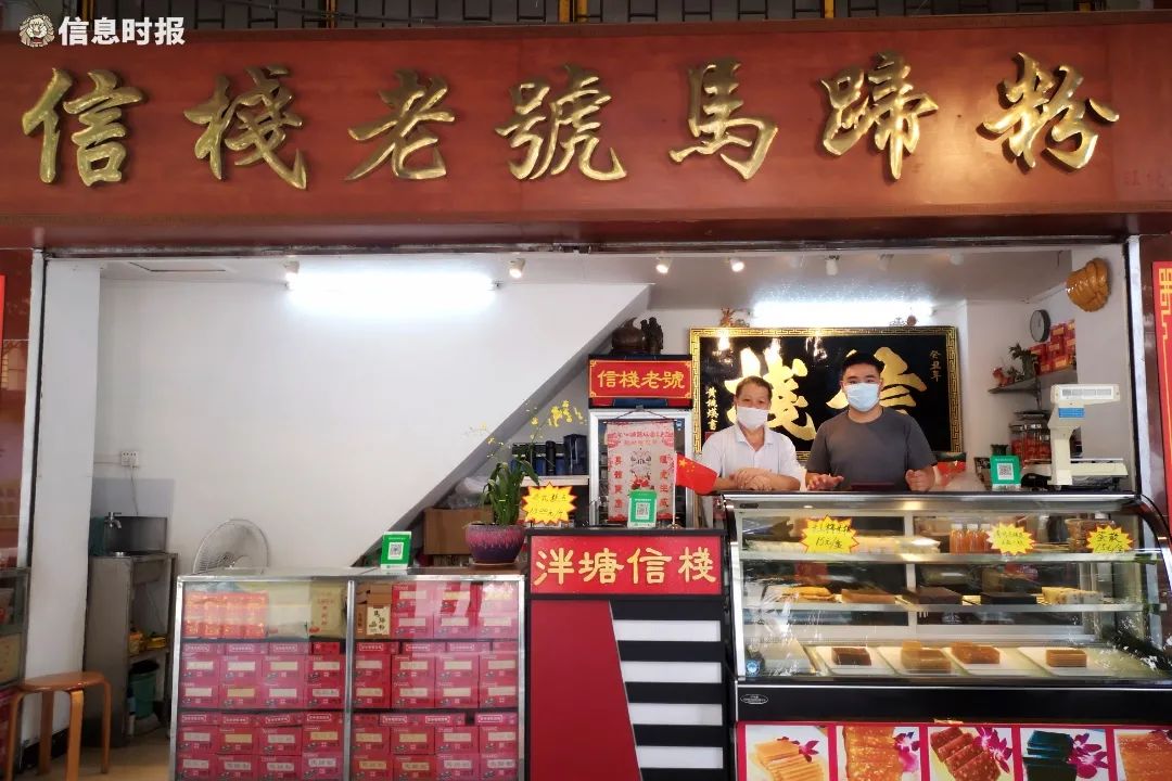 世居泮塘的黄永锐是信栈老铺的第三代传人,“我家从阿爷那代就开始磨马蹄粉啦,小时候,我们家老店就开在荔枝湾涌旁,与文塔隔着河涌对望。旧屋有3层高,首层卖马蹄粉,工人们在屋前的空地磨马蹄粉,每年春节前是生意最忙的时候。20世纪60年代旧屋拆迁,信栈才搬到了如今的龙津西路。”