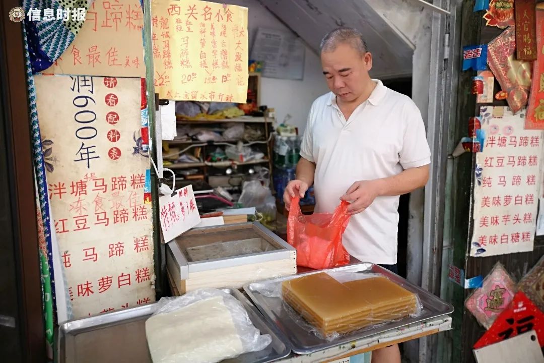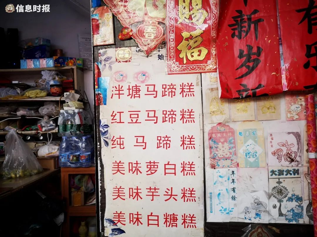 “西关名小食”“千层马蹄糕”“特靓萝卜糕”……在龙津西路与多宝路路口,有一家传统手作马蹄糕店。店面不过三五平方米,但店门口红色字迹的手写“招牌”格外复古吸睛。旁边摆放着的报纸、收音机等生活用品,让这家小铺子更添烟火气。