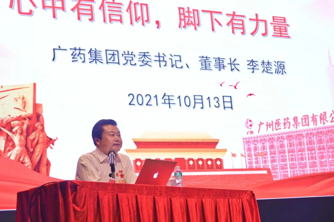 活动中,李楚源董事长以“心中有信仰,脚下有力量”为主题,回顾了广药集团如何发挥党建引领,在时代浪潮中一步步发展壮大,成功迈入世界500强企业的奋斗历程,并分享了他赴京参加庆祝中国共产党成立100周年大会的体会和感受。他表示,广药集团将深入学习贯彻习近平总书记“七一”重要讲话精神,引导广大青年以实现中华民族伟大复兴为己任,增强做中国人的志气、骨气、底气,不负时代,不负韶华,不负党和人民的殷切期望。