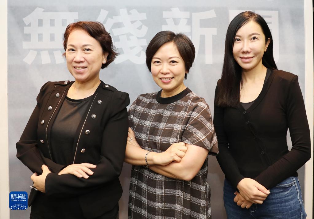《無窮之路》節目的同事,TVB新聞及資訊部高級專題節目經理阮小清、新聞及資訊部總監黃淑明、新聞及資訊部監製岑應(自左至右)在接受新華社記者專訪時合影(10月11日攝)。新華社記者 吳曉初 攝
