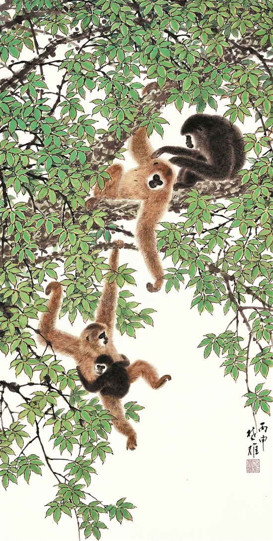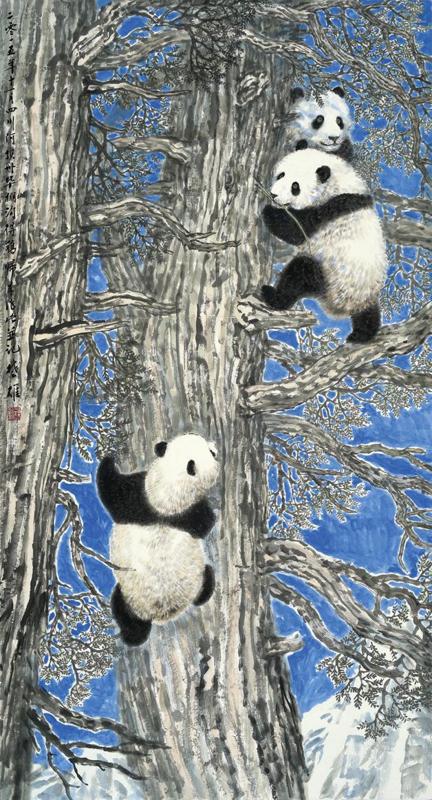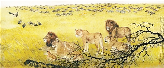 本次展览的120多幅作品里,非洲狮、野象群、大熊猫,这些传统中国画并不多见的题材构成了方楚雄个人画展的主体。