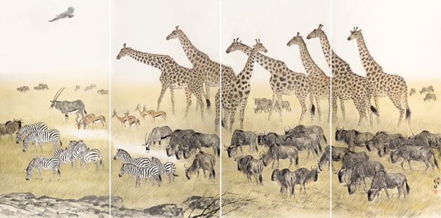 “角马,一望无际的角马在草原上奔腾,湖边的火烈鸟整片飞起的时候,天边就升起来一片红霞……”三年前肯尼亚草原动物大迁徙的场景,让当时正在采风的画家方楚雄至今难以忘怀。三年后,一张名为《天地生灵》的中国画,将画家脑海中的非洲记忆搬上宣纸,乃至以此为名,举办个人画展。