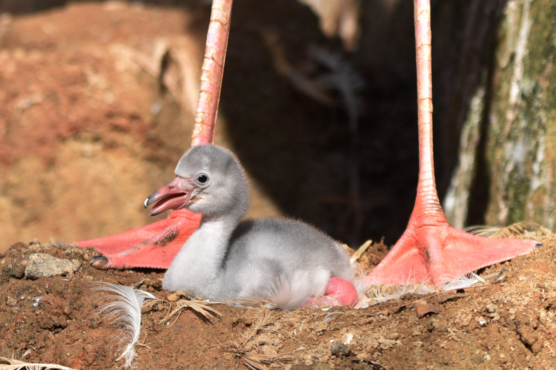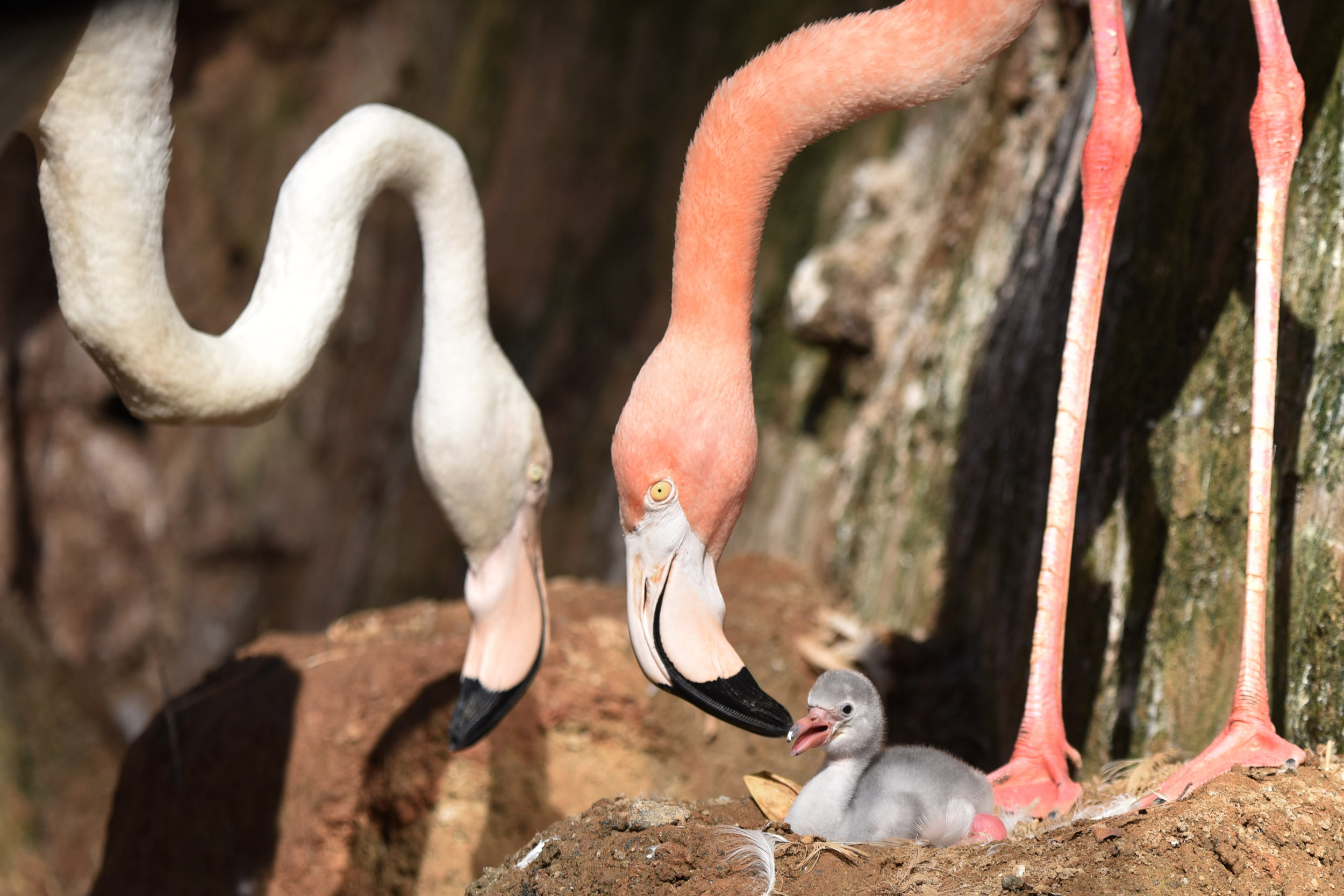 动物园饲养员介绍,火烈鸟雏鸟出壳后,“妈妈”就会数次短时间站起来观察雏鸟,并让雏鸟晒太阳。晒太阳可以为雏鸟提升热量、促进其体内钙、磷的正常代谢,还起到杀菌的作用,预防皮肤病的发生,有利于羽毛的生长。