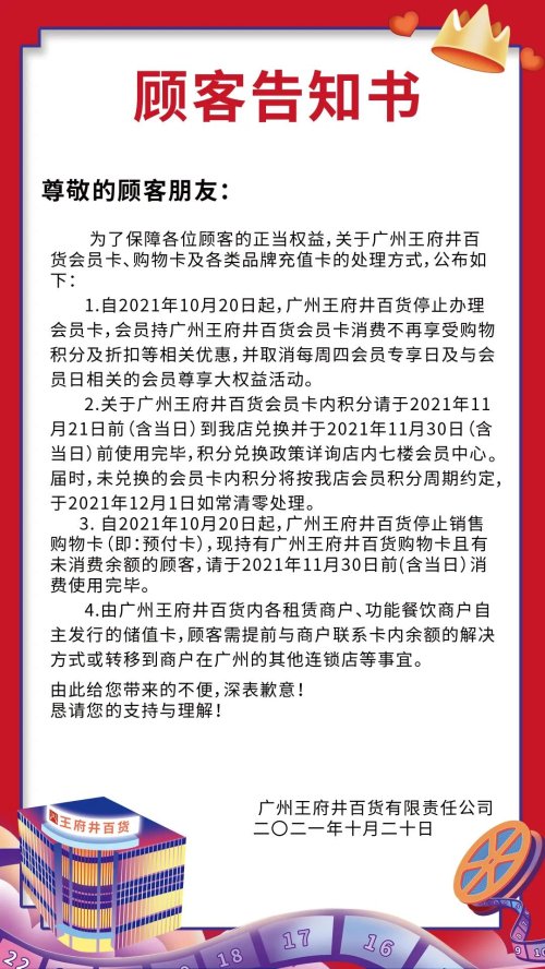 同时,广州王府井百货还发布了顾客告知书,公布了关于广州王府井百货会员卡、购物卡及各类品牌充值卡的处理方式。根据顾客告知书,自2021年10月20日起,广州王府井百货停止办理会员卡,会员持广州王府井百货会员卡消费不再享受购物积分及折扣等相关优惠,并取消每周四会员专享日及与会员日相关的会员尊享大权益活动。关于广州王府井百货会员卡内积分请于2021年11月21日前(含当日)到店兑换并于2021年11月30日(含当日)前使用完毕,积分兑换政策详询店内七楼会员中心。届时,未兑换的会员卡内积分将按该店会员积分周期约定,于2021年12月1日如常清零处理。自2021年10月20日起,广州王府井百货停止销售购物卡(即预付卡),现持有广州王府井百货购物卡且有未消费余额的顾客,请于2021年11月30日前(含当日)消费使用完毕。由广州王府井百货内各租赁商户、功能餐饮商户自主发行的储值卡,顾客需提前与商户联系卡内余额的解决方式或转移到商户在广州的其他连锁店等事宜。