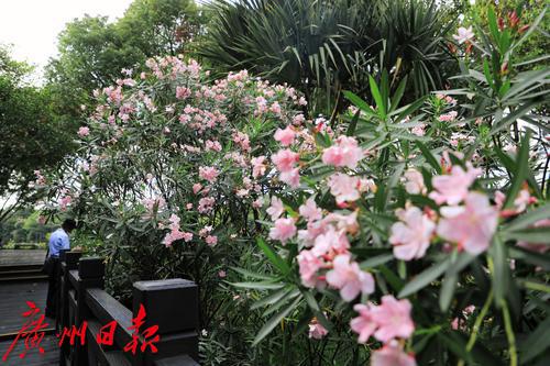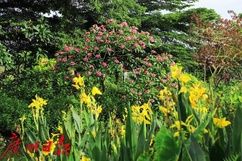 海珠湿地各种果树和植物非常丰富,鸡蛋花、美人蕉、勒杜鹃、夹竹桃、大叶紫薇、荷花等各种花卉四季常开,景色如春。