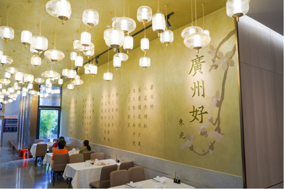 广州十三行文化科技中心三楼,是银灯食府新的经营场址,在这,老食客走进来便能感受到熟悉的感觉。一面墙上设有大型《广州好》诗词书法,装饰窗花则以老广州风物为主。大厅屏风雕刻着长堤风貌,包括:沙面、南方大厦、海珠广场等。经营团队表示,做好广州美食的同时,也想宣传广州文化,让外地食客多了解广州的风土人情。