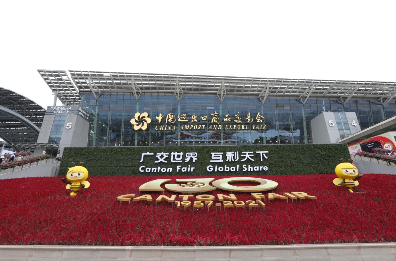 琶洲广交会展馆内外花团锦簇、红绸飞扬第130届广交会主题字样