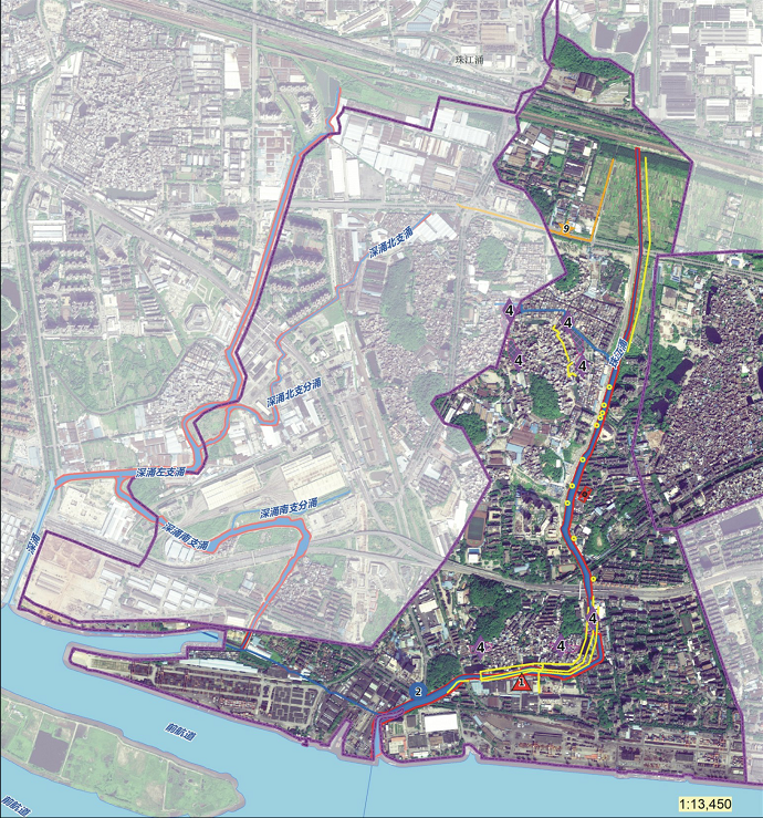 其中珠江涌珠江村铁路边至东苑是黄埔街管辖范围,总长度为3790米。