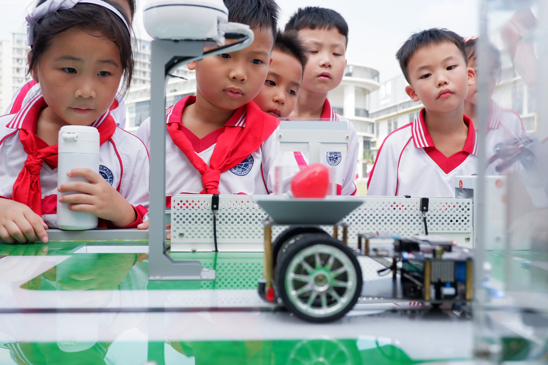 学生观察使用了人工智能技术的“无人仓储装载车”。