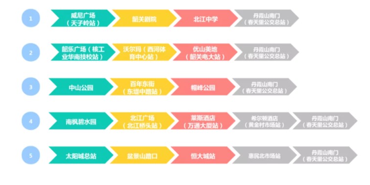 线路4:南枫碧水园→北江广场(北江桥头站)→莱斯酒店(万通大厦站)→希尔顿酒店(黄金村市场站)→丹霞山南门(春天里公交总站)