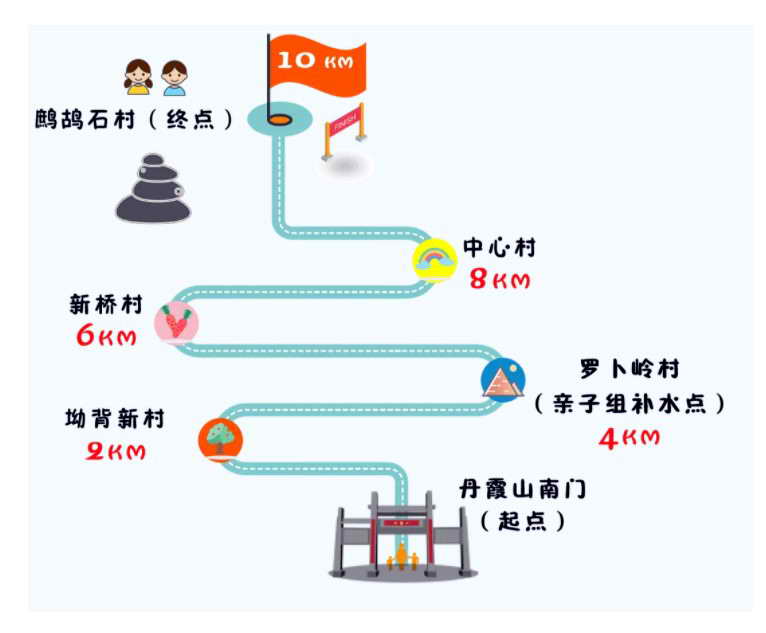 活动具体路线:丹霞山南门(起点)→坳背新村→罗卜岭村→赤岸村→新桥村→牛栏前村→社前村→鹧鸪石村(终点)