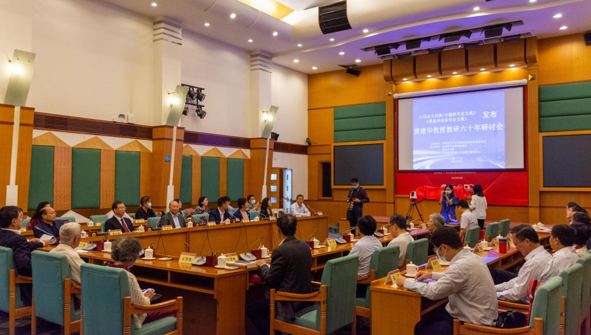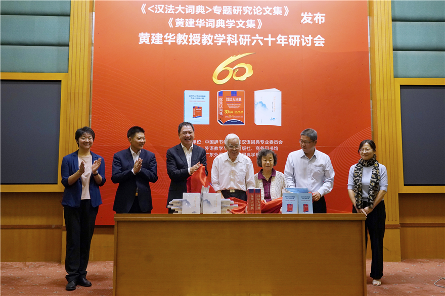 原广州外国语学院院长、广东外语外贸大学首任校长黄建华教授又有重磅新书发布!记者从广东外语外贸大学了解到,近日,《<汉法大词典>专题研究论文集》《黄建华词典学文集》发布暨黄建华教授教学科研六十年研讨会(以下简称“研讨会”)在 该校北校区国际会议厅举行。本次会议由中国辞书学会双语词典专业委员会主办,外语教学与研究出版社、商务印书馆协办,广东外语外贸大学词典学研究中心承办,采取线上线下结合的方式召开。