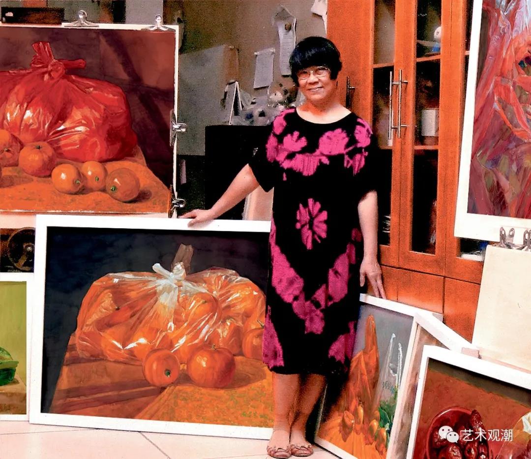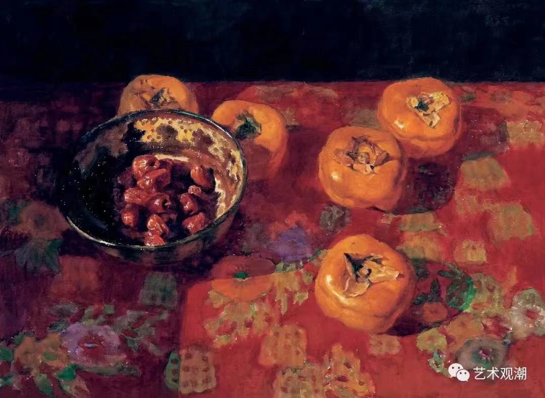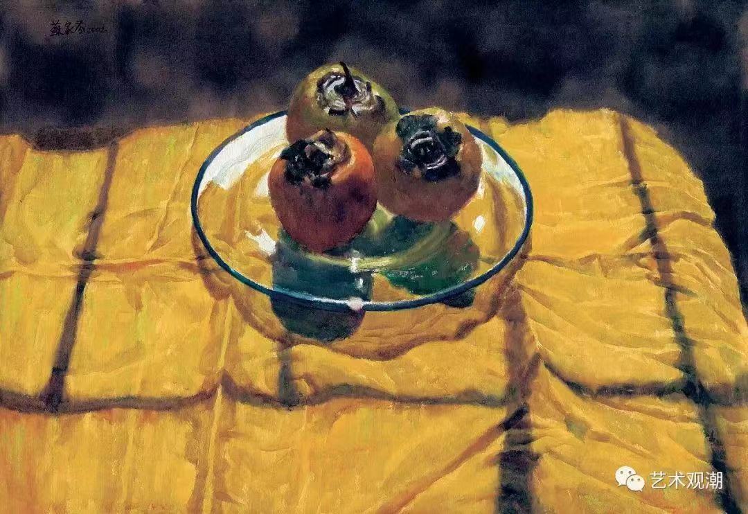 苏家芬:我从脑海中构思静物组合开始,到静物的摆设,到动笔构图直至完成都要考虑:视觉冲击力。这在我创作实践中很重要。我认为的视觉冲击力:第一眼就被对象吸引。如强有力的造型,又如强烈浓郁的色彩或极清淡的色调,或是奇特的构图、或是极强的质感,或是特定的光影等。那一样突出就抓紧把它表达到极致。其实,作画过程基本把整个精神放在如何用色彩塑造型体,质感和空间上。至于给观者有轻松感我也意外——我认为一张画面需留有局部作“写“的表达。比如果实的枝杆,叶子的尖端。另外就是必须有一局部有水渗透的感觉。总之,每一幅画我都努力表达空间,因为一切物像都在一定空间里。