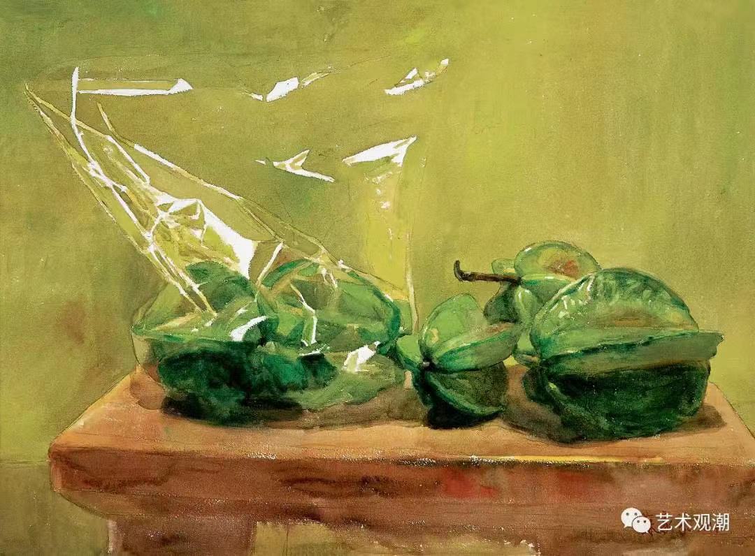 苏家芬:这靠的就是调子。我画静物时,会让静物笼罩在一层光中——这层光,就是营造这氛围的妙招。这层光,最能体现就是在高光的刻画中:高光有很多种高光,胶袋的高光、水果的高光、衬布的高光、器皿的高光、通透的高光、磨砂的高光……由于这些不同的高光的刻画使得画面有更清晰的调子。