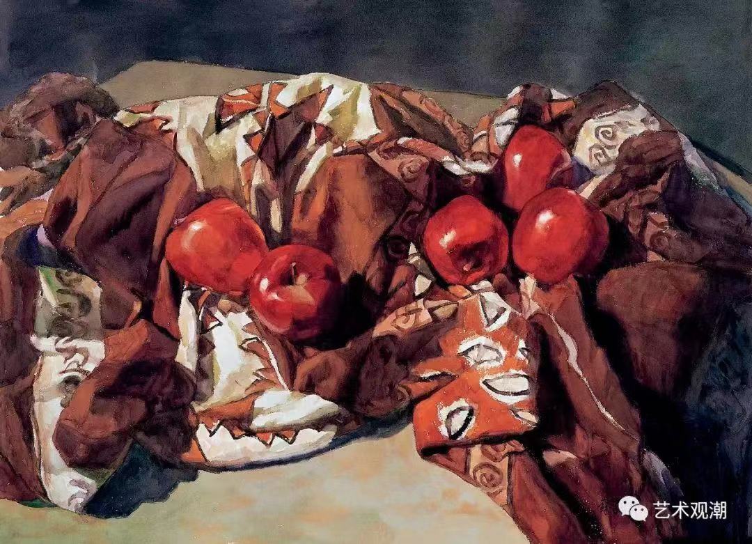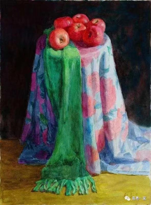 《在花布上的红苹果》水彩 苏家芬