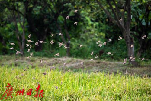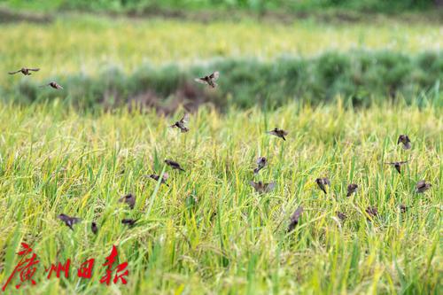 海珠湿地,成群麻雀从稻田中起飞。