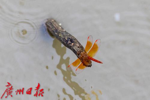 海珠湿地,红蜻蜓在枯木上停留。