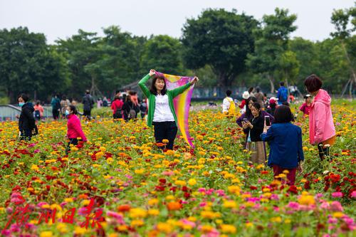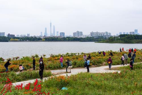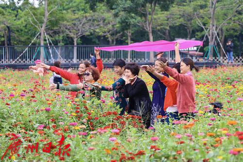 海珠湖,市民在花海中拍照留念。