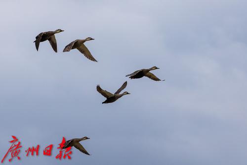 海珠湿地,结伴飞行的鸟。
